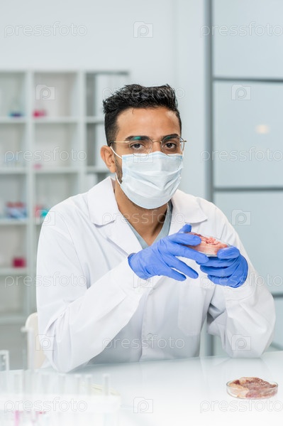 Молодой перчатый научный исследователь в белом халате, маске и очках