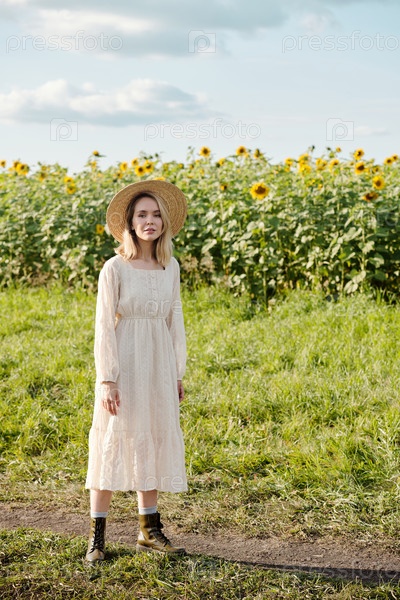 Счастливая молодая блондинка в шляпе и белом романтическом платье, стоящая на зеленой траве