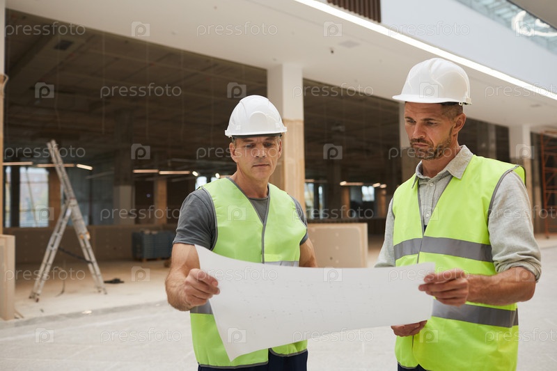 Два строительных работника обсуждают планы