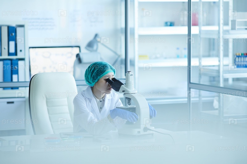 Врач, использующий микроскоп на работе