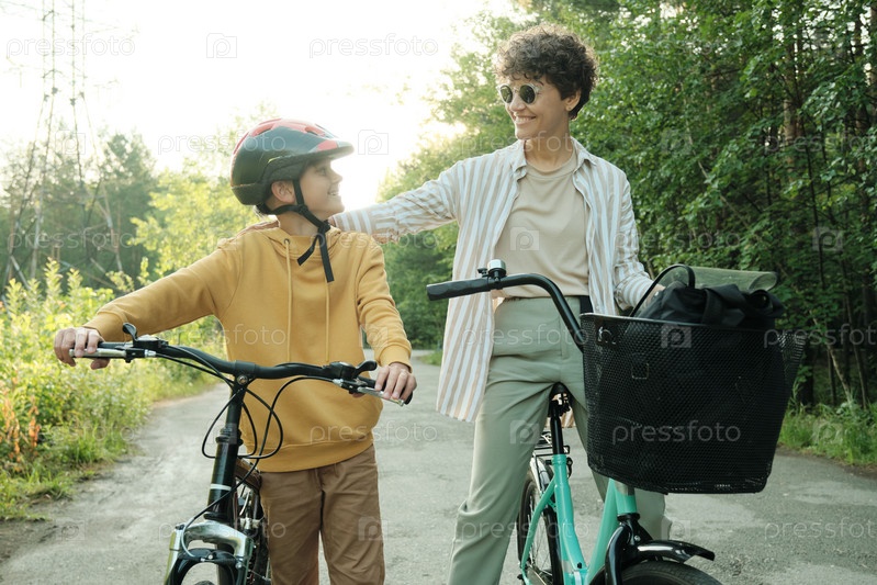 Счастливая молодая мать в повседневной одежде и солнцезащитных очках, поощряющая своего юного сына