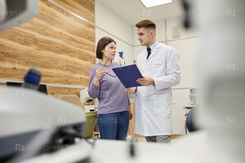 Молодая женщина разговаривает с врачом в клинике офтальмологии