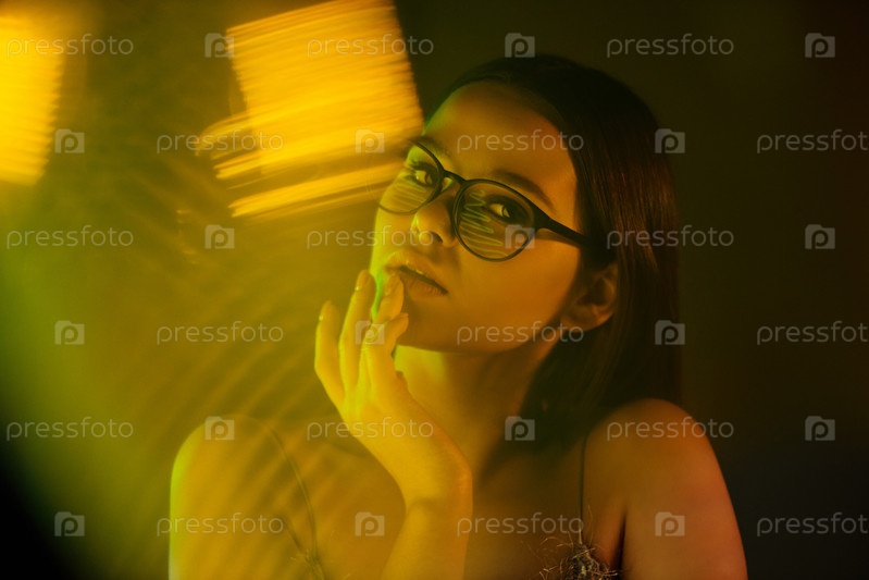 Молодая привлекательная женщина в очках, сидящая у окна перед камерой