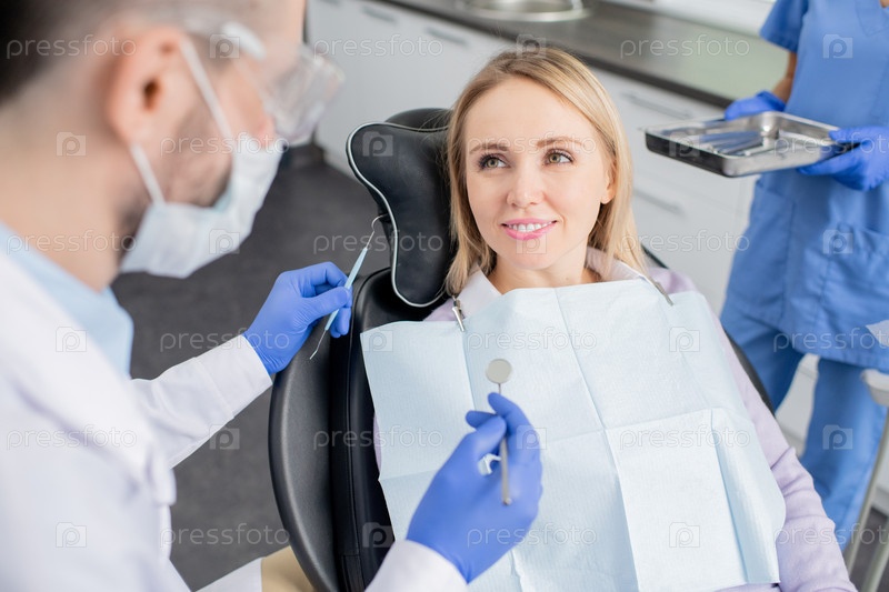 Молодая улыбающаяся блондинка-пациентница стоматологических клиник, смотрящая на своего зубного врача