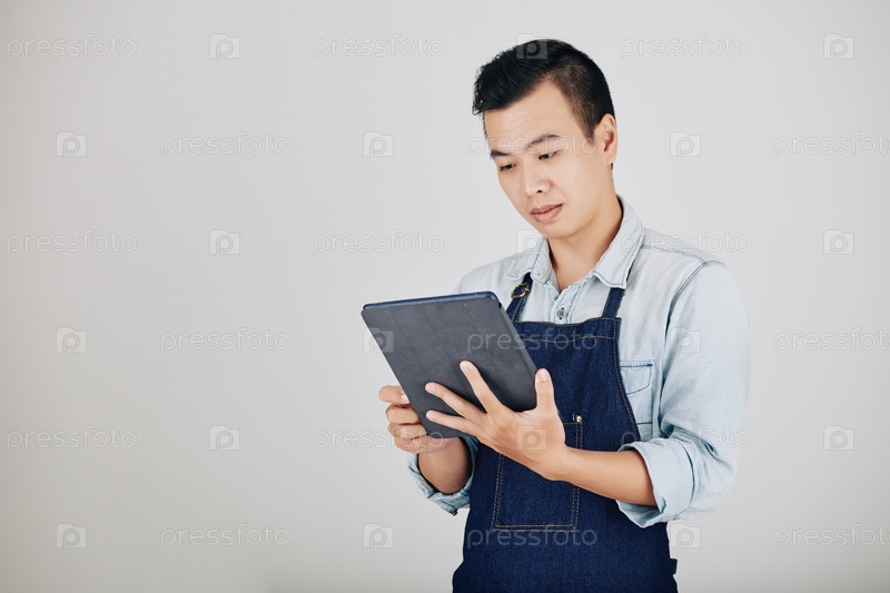 Работник кафе читает приказ на планшете