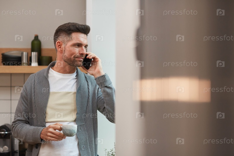Взрослый мужчина пьет кофе утром