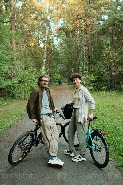 Молодая радостная пара с велосипедами стоит между деревьями перед камерой