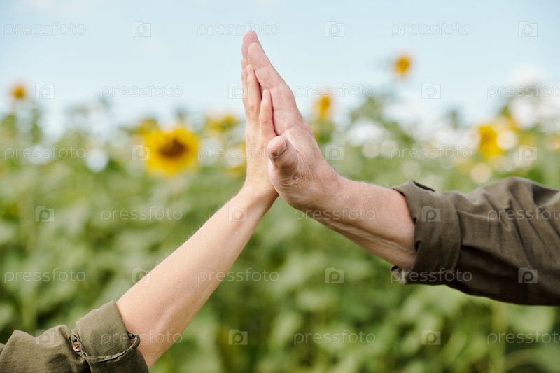 Руки старшего фермера-мужчины в рабочей одежде и его зрелой коллеги