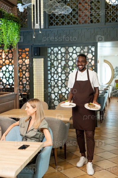 Улыбающийся молодой официант африканской этнической принадлежности, несущий тарелки с заказами женщин
