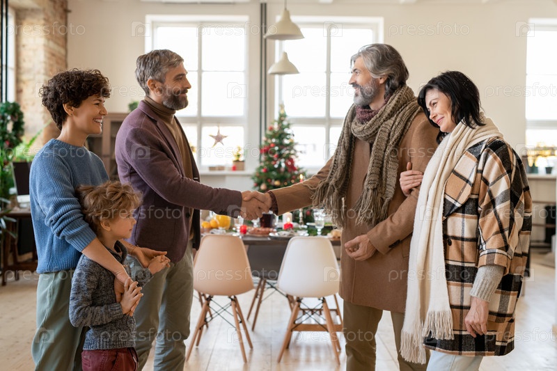 Счастливые молодые и зрелые пары приветствуют друг друга во время рождественского визита