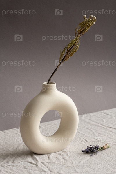 Белая керамическая ваза в форме кольца с сушеными дикими цветами и букетом лаванды