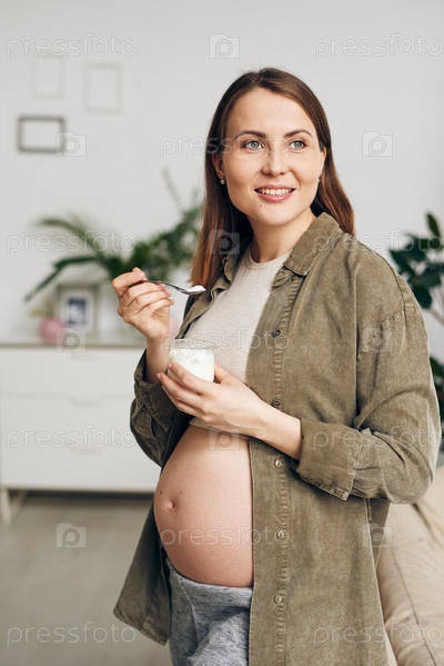 Веселая молодая беременная женщина с зубчатой улыбкой ест вкусный йогурт