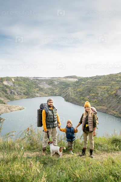 Счастливая молодая семья из трех человек в теплых повседневных одеждах и их милая собака смотрит на вас