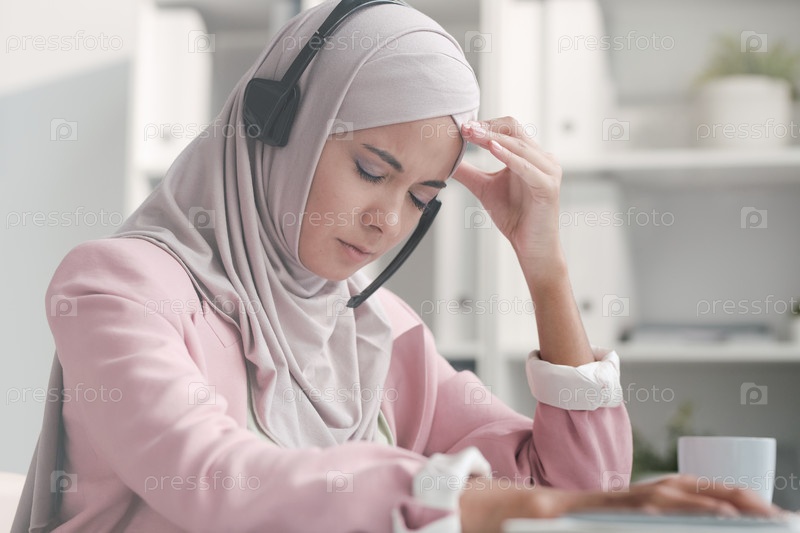 Молодая мусульманская бизнесвумен в хиджабе и наушниках страдает от головной боли