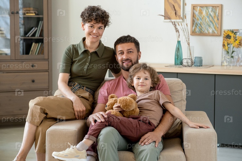 Счастливый молодой человек с милым маленьким сыном и его красивой женой, сидящей в кресле