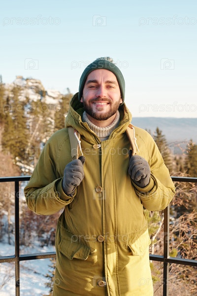 Молодой улыбающийся мужской рюкзак, стоящий на деревьях и скалах, покрытых снегом