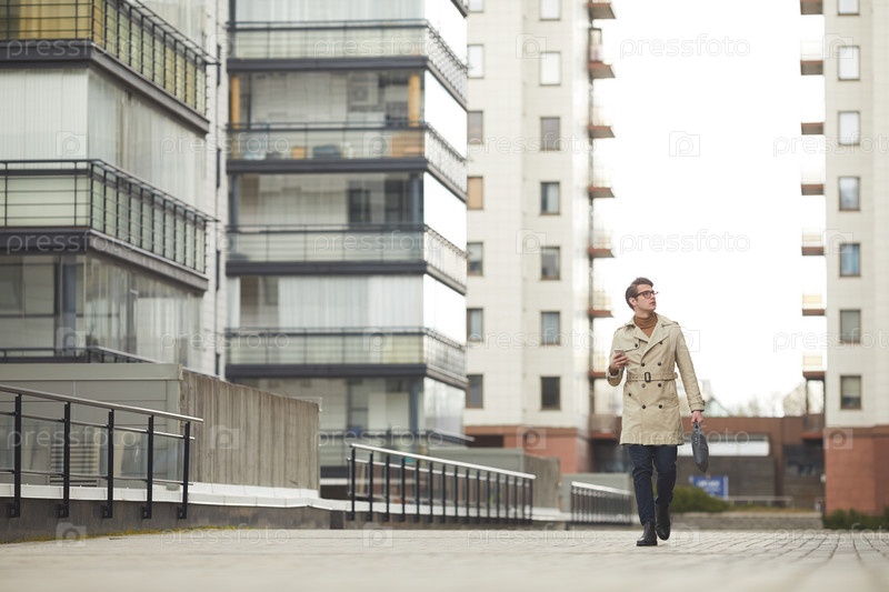 Бизнесмен ходит по городу на заднем плане