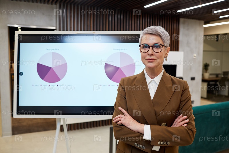 Зрелая женщина-менеджер стоит у цифровой доски