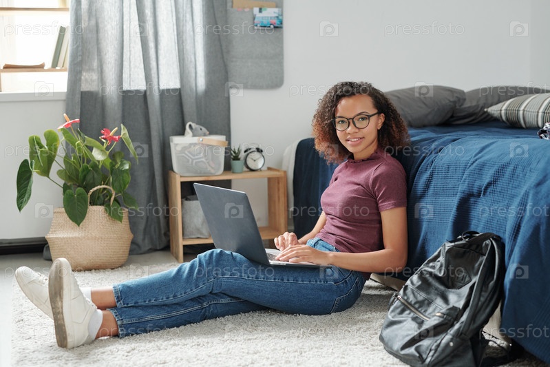 Молодая веселая студентка в общих чертах casualwear на полу возле кровати