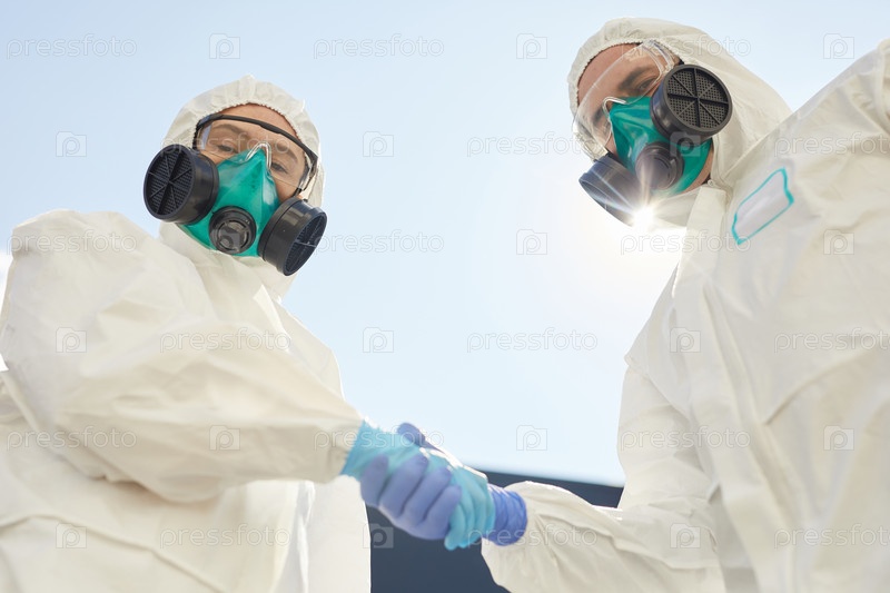 Двое работников дезинфекции пожали друг другу руки
