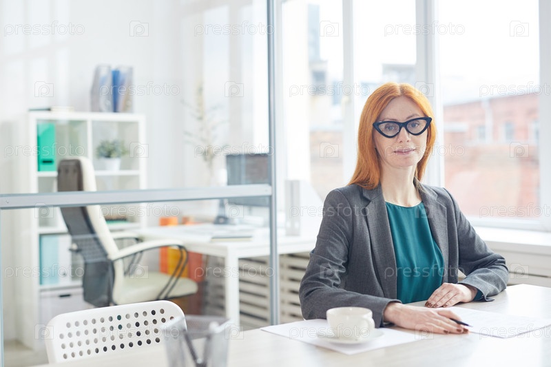 Красноволосая бизнесвуменка позирует на рабочем месте