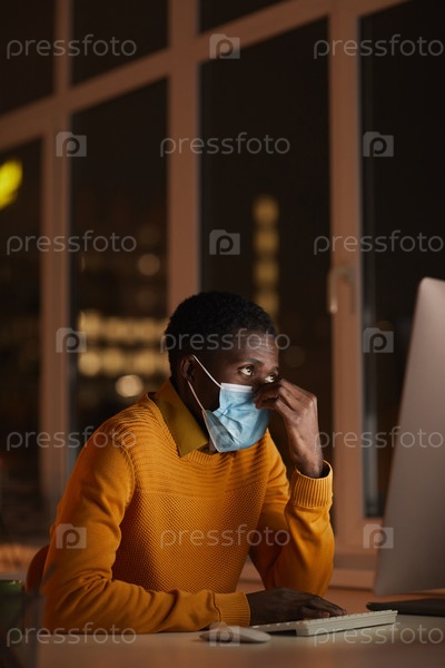 Усталый афроамериканец, носящий маску в офисе