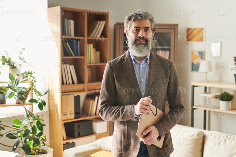 Серьезный зрелый мужчина-профессионал в формальной одежде, держащий очки и клипборд