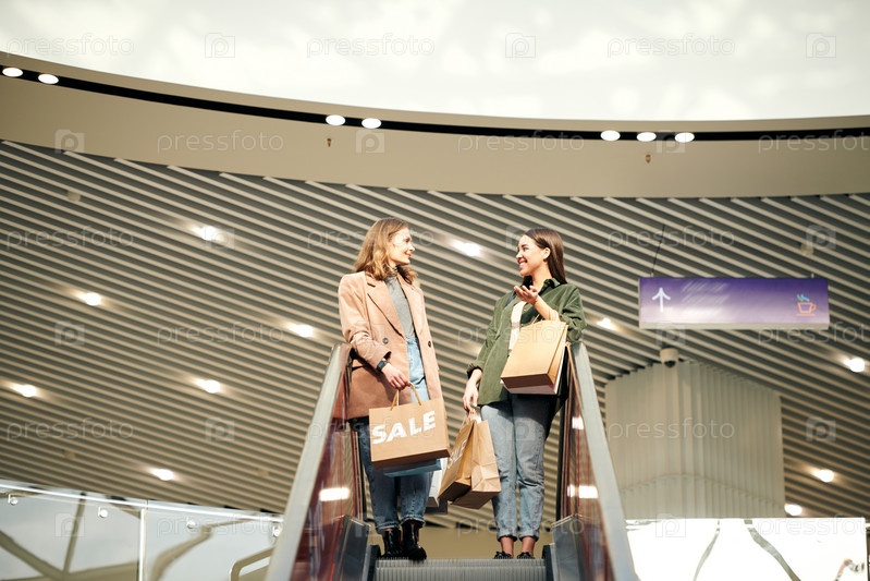 Две молодые женщины в повседневной одежде держат бумажные пакеты, стоя на лифте