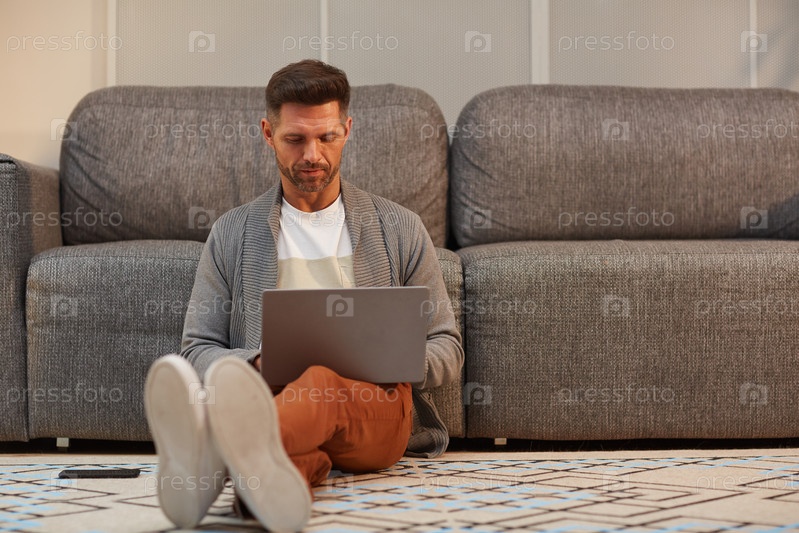 Зрелый мужчина работает с ноутбуком на полу