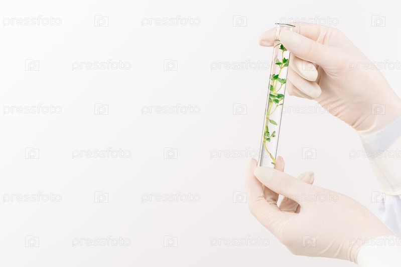 Перчатки рук биолога или ученого, держащего флакон с растением в воде
