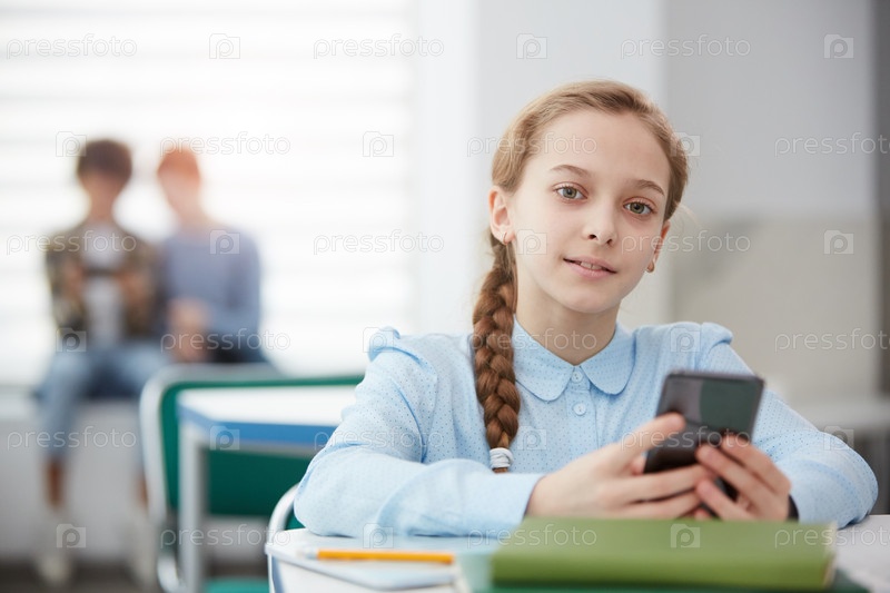 Девочка, использующая смартфон в школьном классе