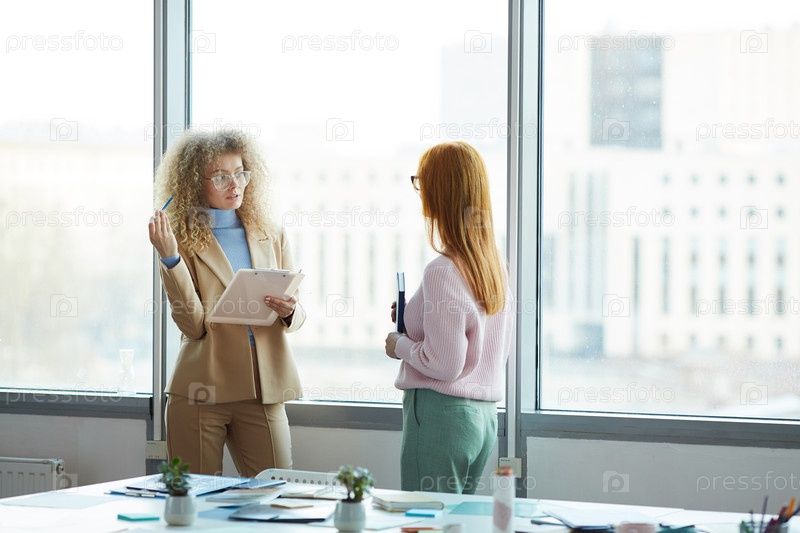 Современные деловые женщины, разговаривающие у окна в офисе
