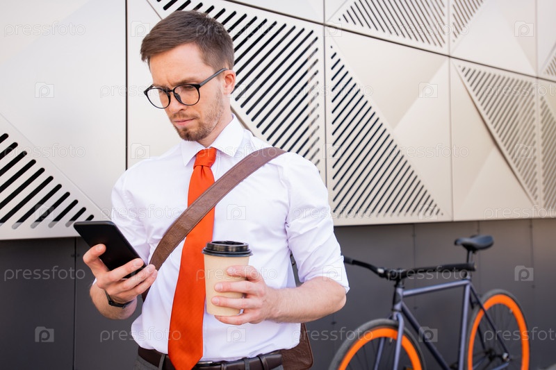 Серьезный мужчина со стаканом кофе и смартфоном, смотрящий через контакты