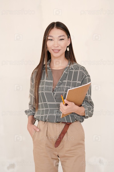 Молодая азиатская бизнесвумен в умной повседневной одежде стоит на белом стене
