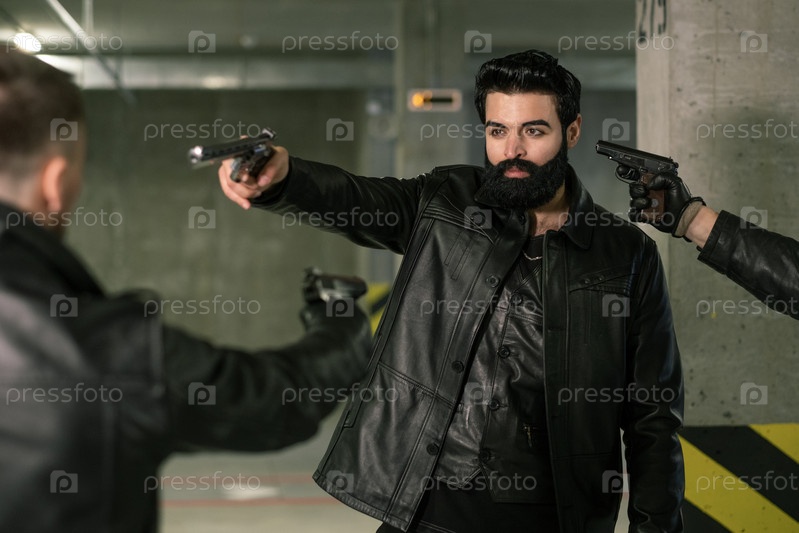 Бородатый убийца или террорист в черном кожаном куртке направляет пистолет на жертву