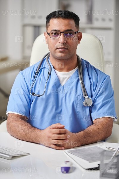 Вертикальный средний портретный снимок серьезного профессионального медицинского специалиста в синей форме, сидящего за столом в офисе и смотрящего на камеру