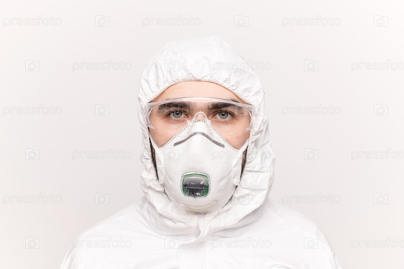 Глава молодого клинициста или ученого-мужчины в защитной рабочей одежде смотрит на вас