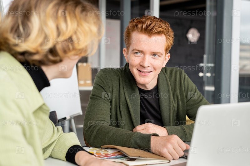 Молодая улыбающаяся разработчик мобильных приложений взаимодействует с коллегой на встрече