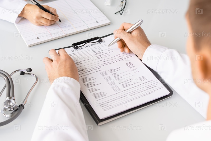Руки врача, заполняющего формы медицинской истории пациентов и его помощника
