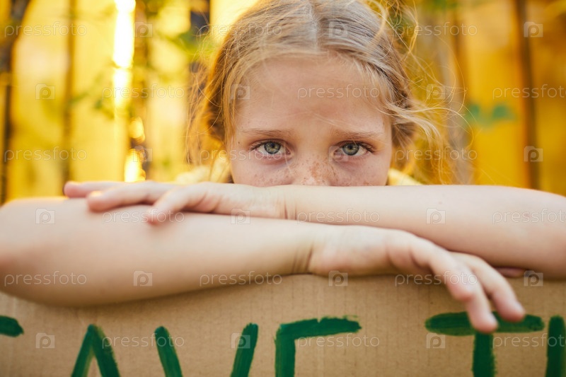 Милая веснухая девушка прячется за табличкой