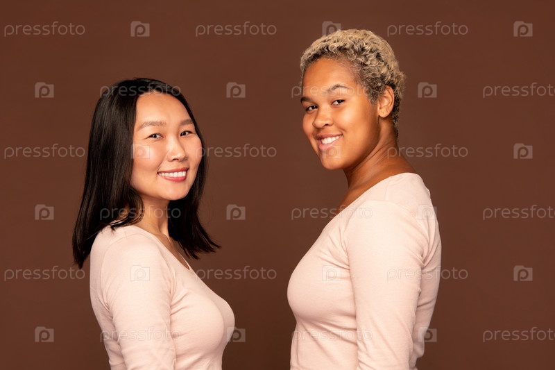 Две молодые веселые женщины с зубчатой улыбкой стоят напротив друг друга