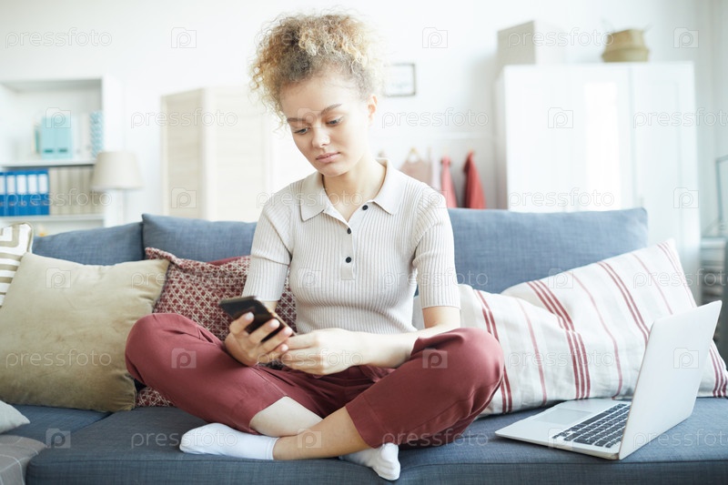 Женщина, использующая мобильный телефон дома