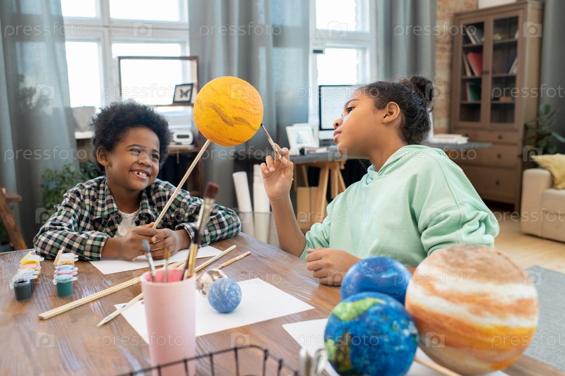 Два очаровательных школьника смешанной расы в повседневной одежде рисуют планеты у стола