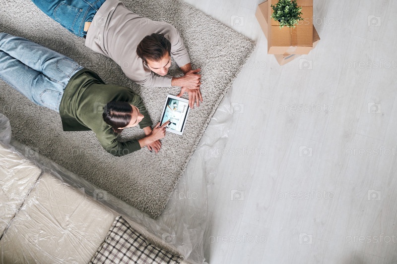 Молодая спокойная пара, лежащая на ковре и прокручивая онлайн-рекламы