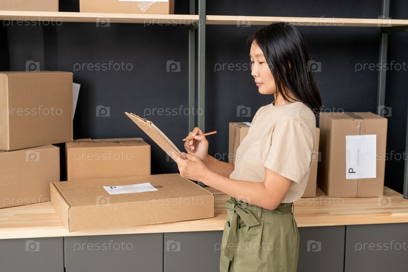Молодая женщина с ручкой и книжной доской проверяет заказы клиентов интернет-магазина
