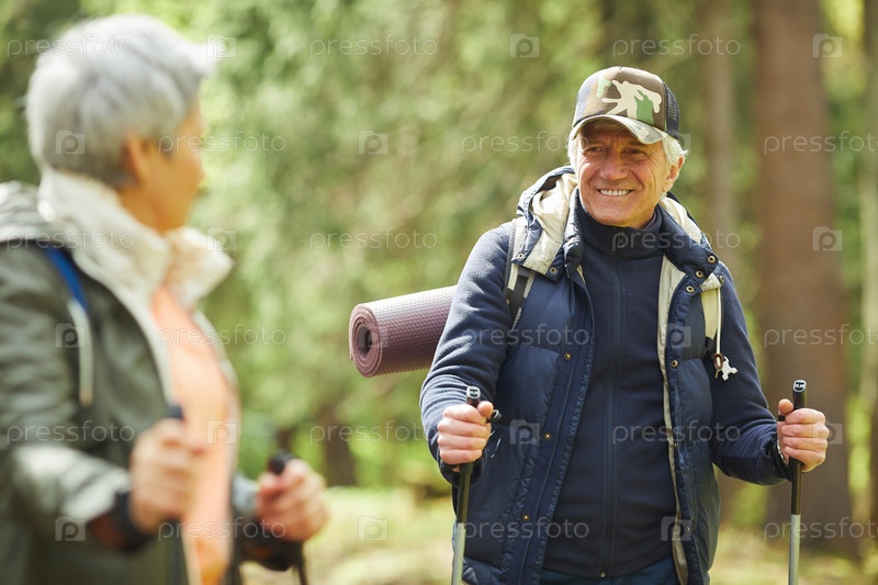 Пожилой мужчина наслаждается нордической прогулкой по лесу