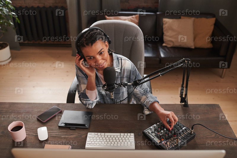 Горизонтальный взгляд под высоким углом молодой видеоблогерки, сидящей за столом в домашней студии и проверяющей настройки звука перед началом съемок
