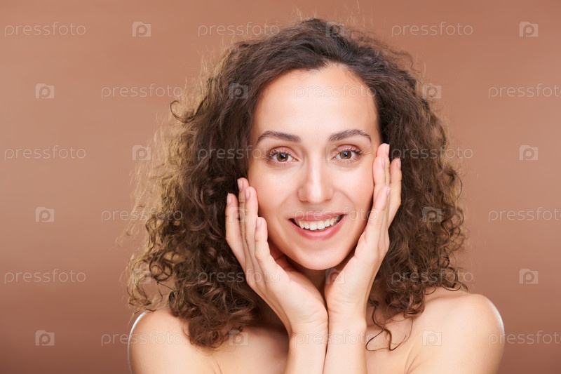 Красивая молодая брюнетка с волнистыми волосами держит руки у лица