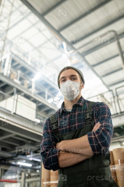 Молодой современный инженер-мужчина большой фабрики, носящий защитную маску