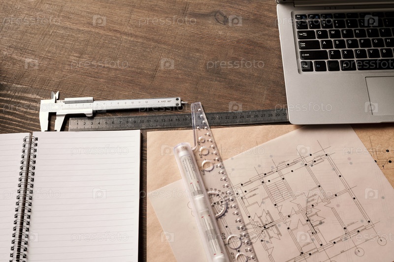 Клавиатура ноутбука, линейки и ручной инструмент, открытый копийник в окружении чертежей